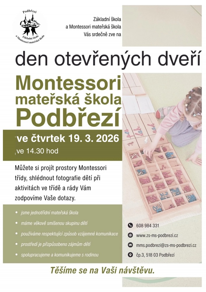 (10.03.2026) Den otevřených dveří v MMŠSrdečně zveme na den otevřených dveří v Montessori mateřské škole v Podbřezí ve čtvrtek 19. března 2026 od 14.30 do 17 hodin.