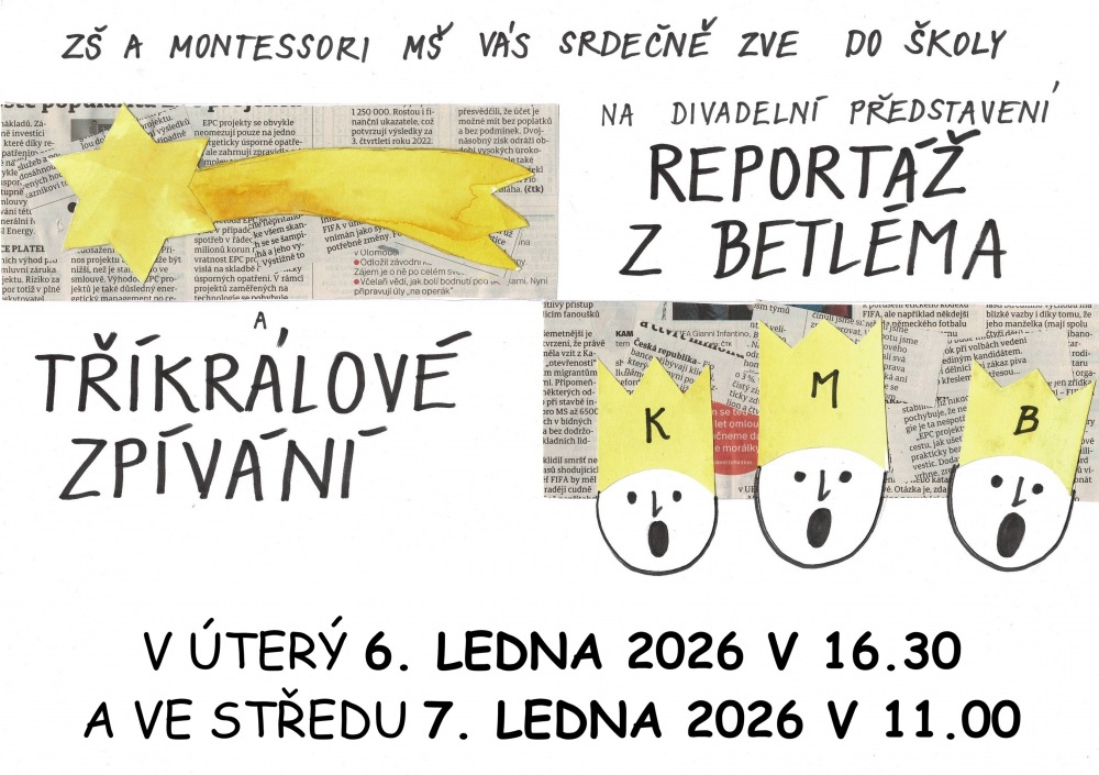 (20.12.2025) Tříkrálové zpíváníSrdečně zveme na Tříkrálové zpívání ve škole v úterý 6. ledna 2026 od 16.30 hodin a ve středu 7. ledna od 11.00 hodin.