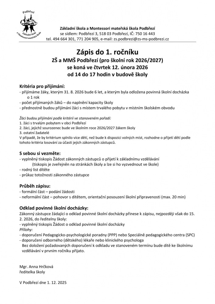 (01.12.2025) Zápis do 1. ročníku pro školní rok 2026/2027Zápis do 1. ročníku základní školy se koná ve čtvrtek 12. února 2026 od 14 do 17 hodin v budově školy.