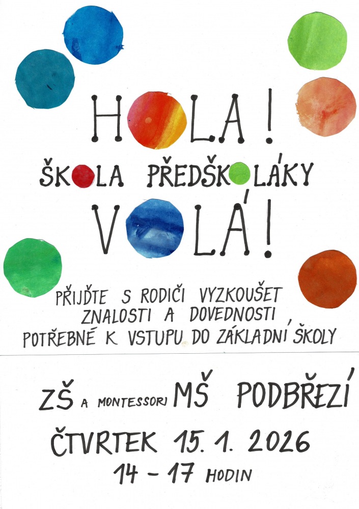 (01.12.2025) Hola, škola předškoláky volá!Zveme předškoláky s rodiči do školy ve čtvrtek 15. ledna 2026 v čase mezi 14. a 17. hodinou. Přijďte si vyzkoušet znalosti a dovednosti potřebné do první třídy.